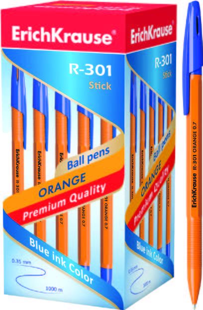връх и сменящ се пълнител. Химикалката има непрозрачно, оранжево шестоъгълно тяло с удобна профилирана грип зона и вентилирана капачка. Цветът на капачката и накрайника отговарят на цвета на мастилото. 5-каналният връх и 0.7 мм диаметър на топчето, в комбинация с бързо-съхнещото мастило осигурява меко и удобно писане. Дължината на линията на писане е 2000 м с дебелина на писане 0.35 мм. Моделът R-301 Orange 0.7 stick има разпознаваща се патентована форма и се превърна в абсолютен бестселър сред пишещите продукти Erick Krause в повече от 50 държави по света.