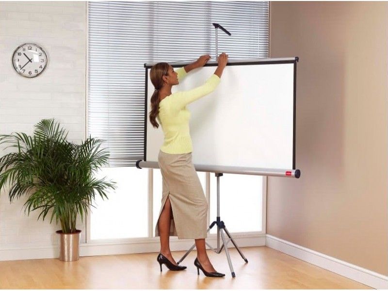 На стойка. 4:3 и 16:10 формата. Матова бяла повръхност за остро и детаилно изображение. Ъгъл на видимост 160 градуса.