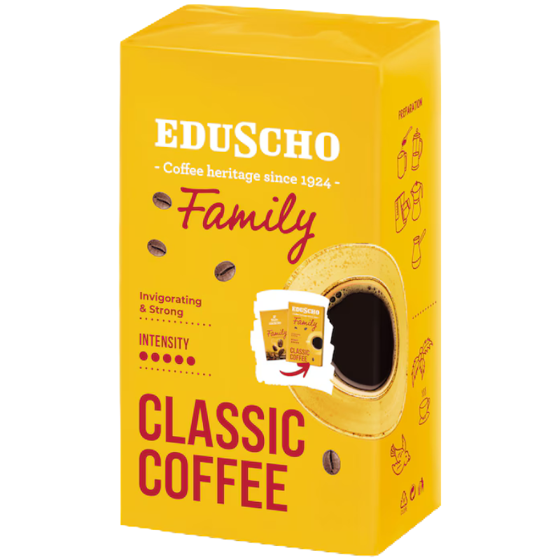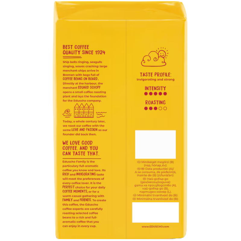 Tchibo Eduscho Family е създадено за всеки ден. Насладете се на кадифена крема, дълготраен аромат и приятно плътно тяло, които превръщат всяка чаша в момент на наслада. Идеално за приготвяне на различни кафе напитки у дома или в офиса.