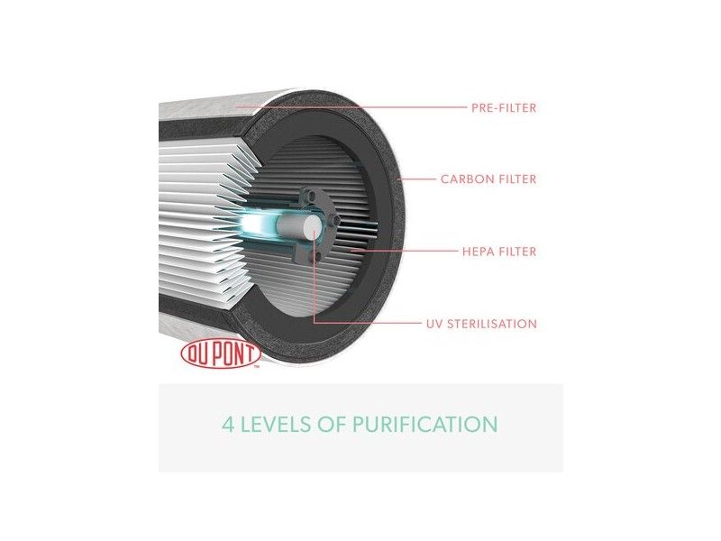 360 градусовият филтър DuPont HEPA улавя замърсители и VOC газове / миризми от всички посоки. UV светлината убива микробите и бактериите, които могат да попаднат във филтъра.