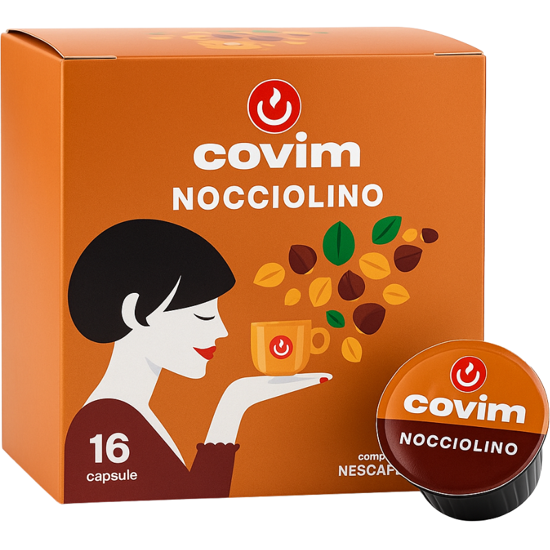 Covim Nocciolino комбинира нежен кафе вкус с фин аромат на лешник, за да създаде сладка, кремообразна и изкушаваща напитка у дома. Съвместими с Dolce Gusto машини, тези капсули са идеални за любителите на ароматизирано кафе с десертен характер.