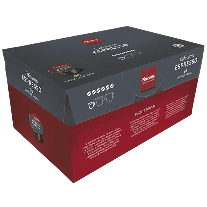 Една кутия Пиачето еспресо съдържа 96 бр. кафе капсули съвместими с Cafissimo/Caffitaly системи.