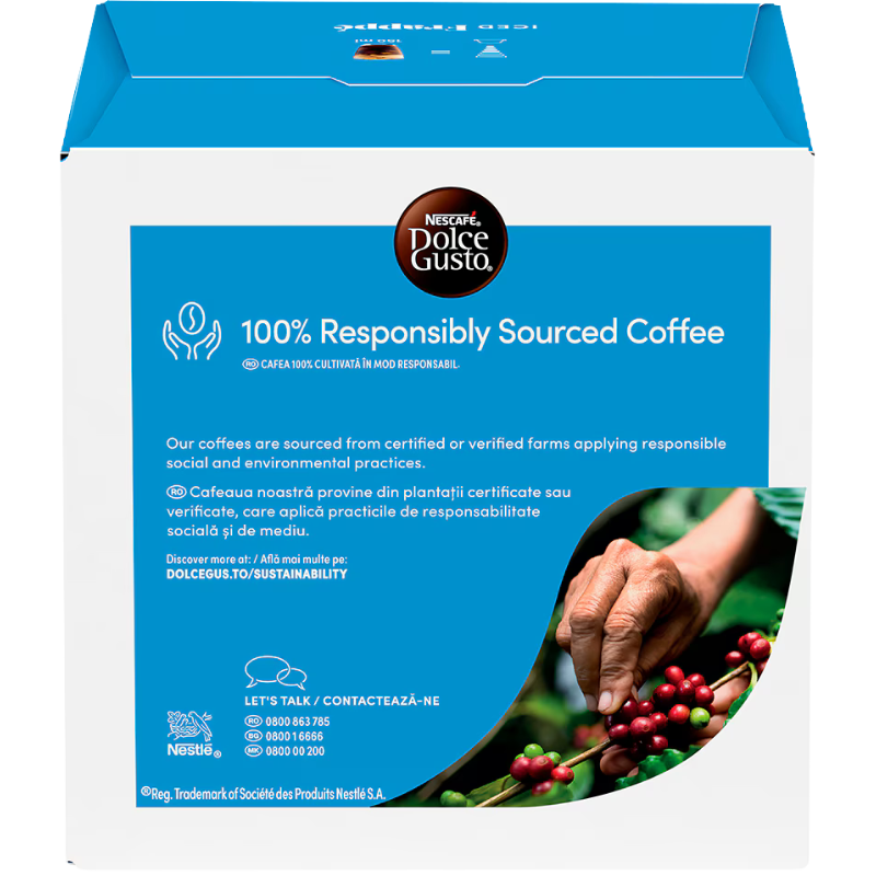 Dolce Gusto Iced Frappe е освежаваща студена кафе напитка, създадена за горещите дни и за всеки, който обича фрапе в стил кафе бар у дома. Комбинира нежен млечен вкус, ароматно кафе и лека пяна, която превръща всяка чаша в истинско лятно удоволствие.