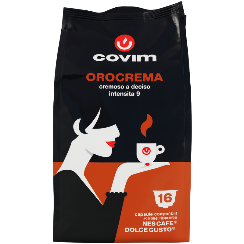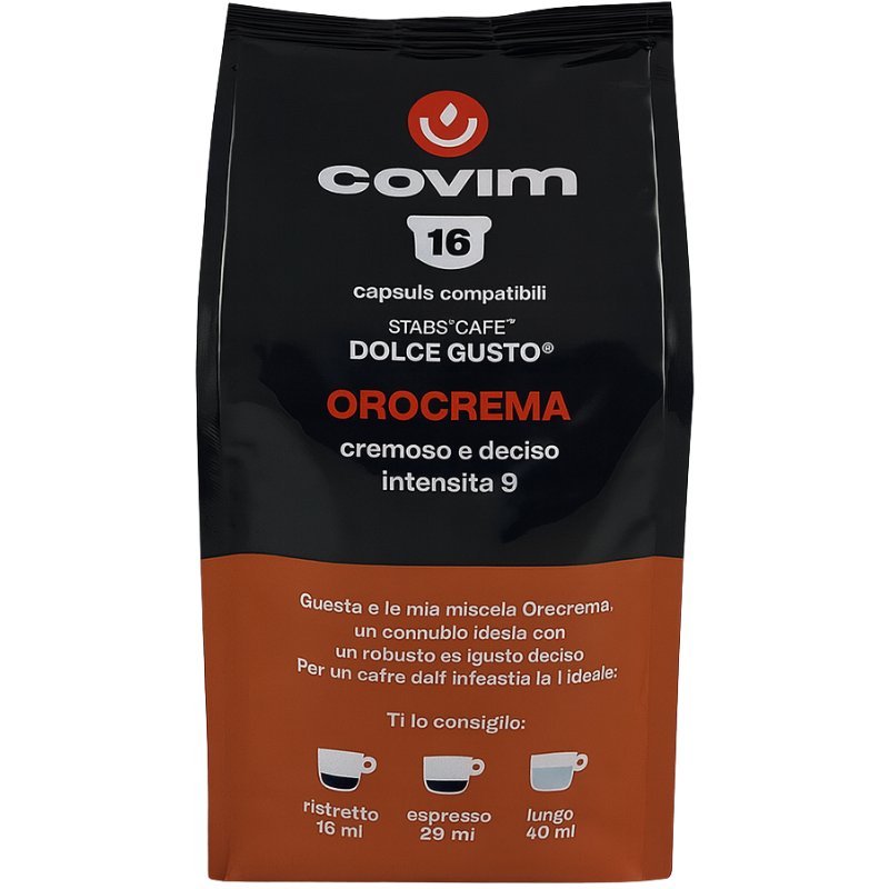Covim Orocrema предлага плътно и ароматно еспресо с гъста, кадифена крема и интензивен вкус – точно като в италианско кафене, но у дома с твоята машина Dolce Gusto. Подходящо за любителите на силно, но балансирано кафе с дълъг послевкус.