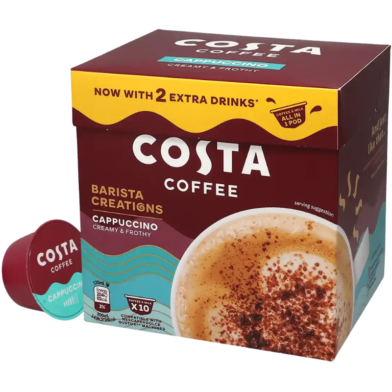 Открийте богатия и кремообразен вкус на Costa Cappuccino, вече и в удобни капсули, съвместими с вашата Dolce Gusto® машина. Насладете се на перфектната чаша капучино с всяка капсула, без да напускате комфорта на вашия дом.