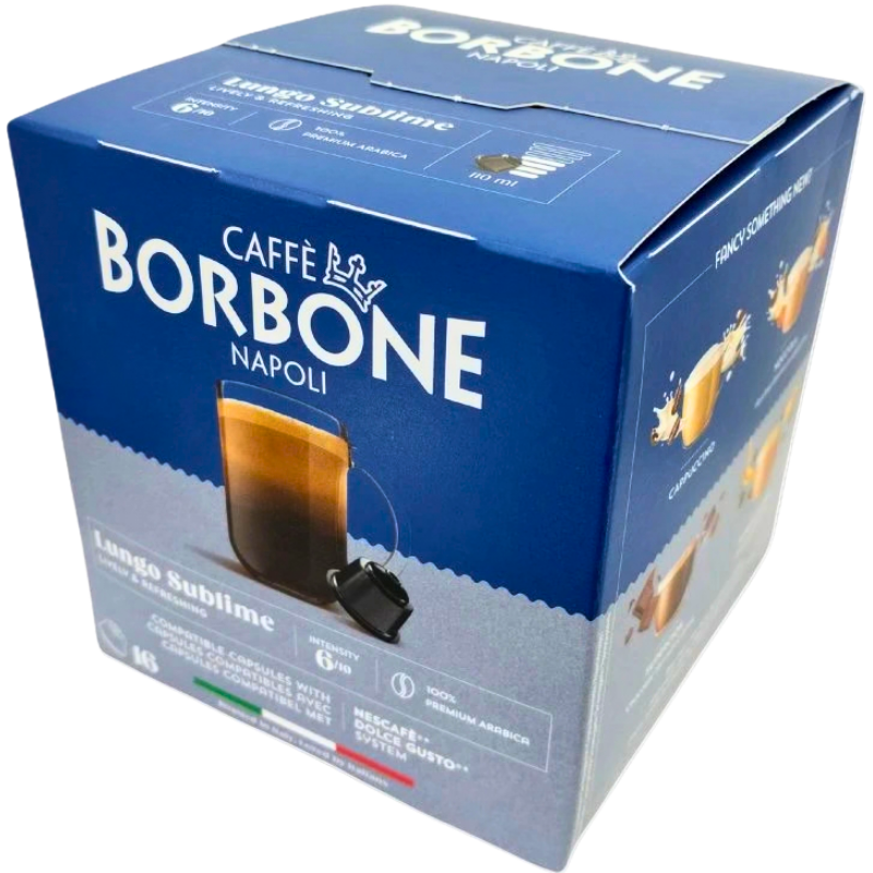 Насладете се на изисканото кафе Borbone Lungo Sublime, сега в удобни капсули, съвместими с вашата Dolce Gusto® машина! ☕ Превъзходен бленд от 100% арабика, внимателно подбран, за да ви предложи несравнимо кафе изживяване.